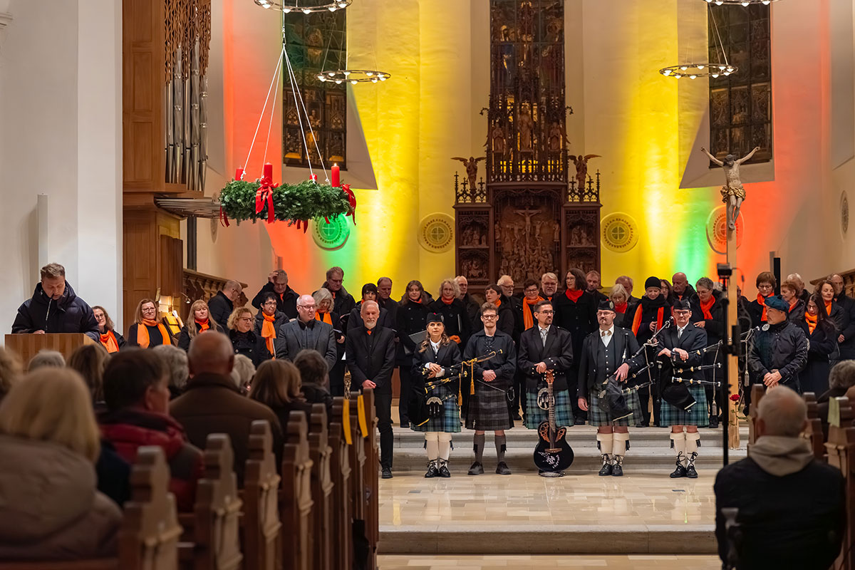 Den Auftakt machte der beeindruckende Einzug der Dudelsackband Highroad unter der Leitung von Robert Reibl, die das Publikum in die mystische Klangwelt Schottlands entführte. Eine magische Atmosphäre erfüllte die Kirche, als KMD Frank Müller an der Orgel gemeinsam mit Fabian Pablo Müller am Saxofon adventliche Improvisationen zum Klingen brachte. Der Gospelchor Durach nahm die Zuhörerschaft mit auf eine Reise in die Wiege des Gospels und ließ mit kraftvollen und gefühlvollen Momenten die spirituelle Tiefe dieser Musik spürbar werden. Einen besonderen Kontrast bot das Ensemble Kern & Kerber, das mit seinen alpenländischen Klängen die Schönheit traditioneller Saitenmusik erlebbar machte.