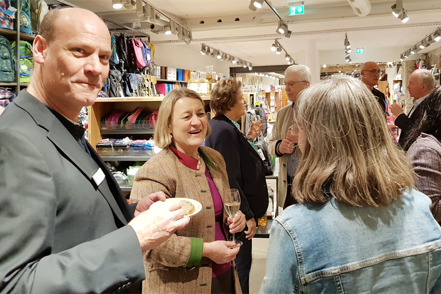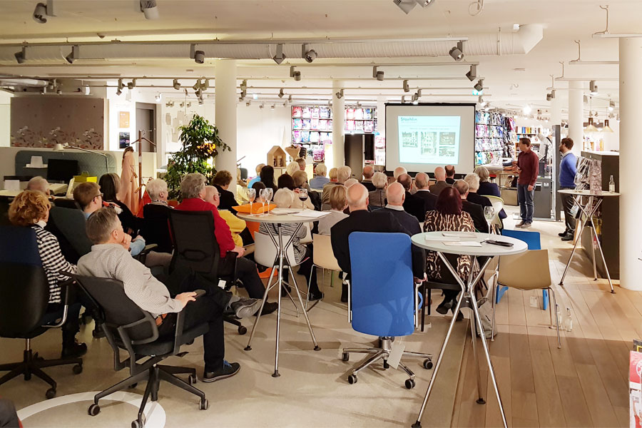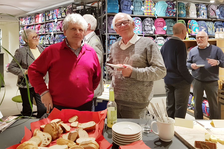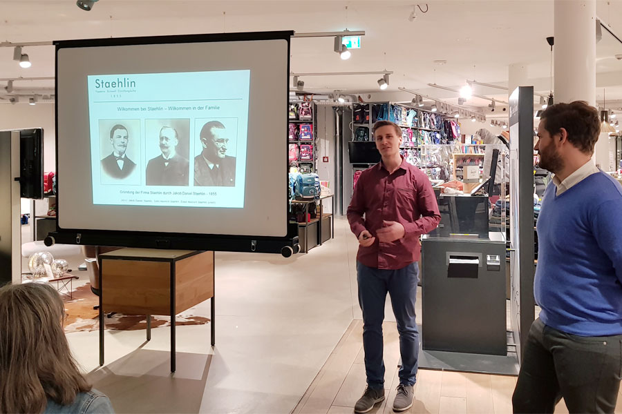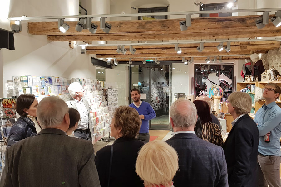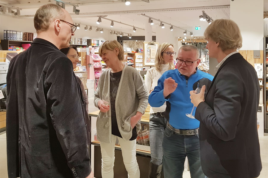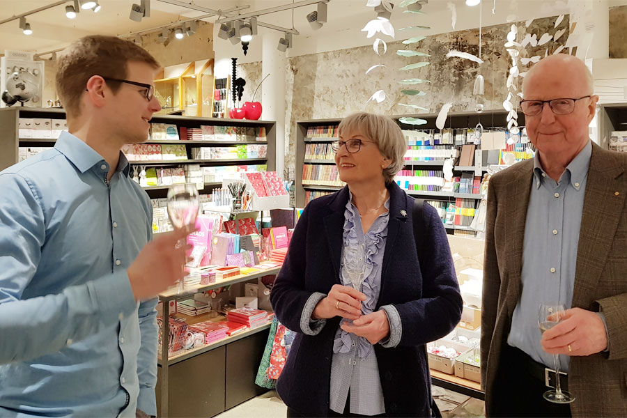 Danach führten Michael und Christian Pickert durch den Abend und nahmen uns mit auf eine kleine Zeitreise, beginnend mit Jakob Daniel Staehlin, der 1855 an der Reichsstraße in Kempten eine Buchbinderei mit Schreibwarengeschäft eröffnete. Heute führt die Familie Pickert in der 5. und 6. Familiengeneration die Firma. Es gab eine Führung hinter die Kulissen mit einem Bericht über die Architektur und die Ziele des Neu- und Ausbaus des Firmenstammhauses aus dem Jahr 2015.